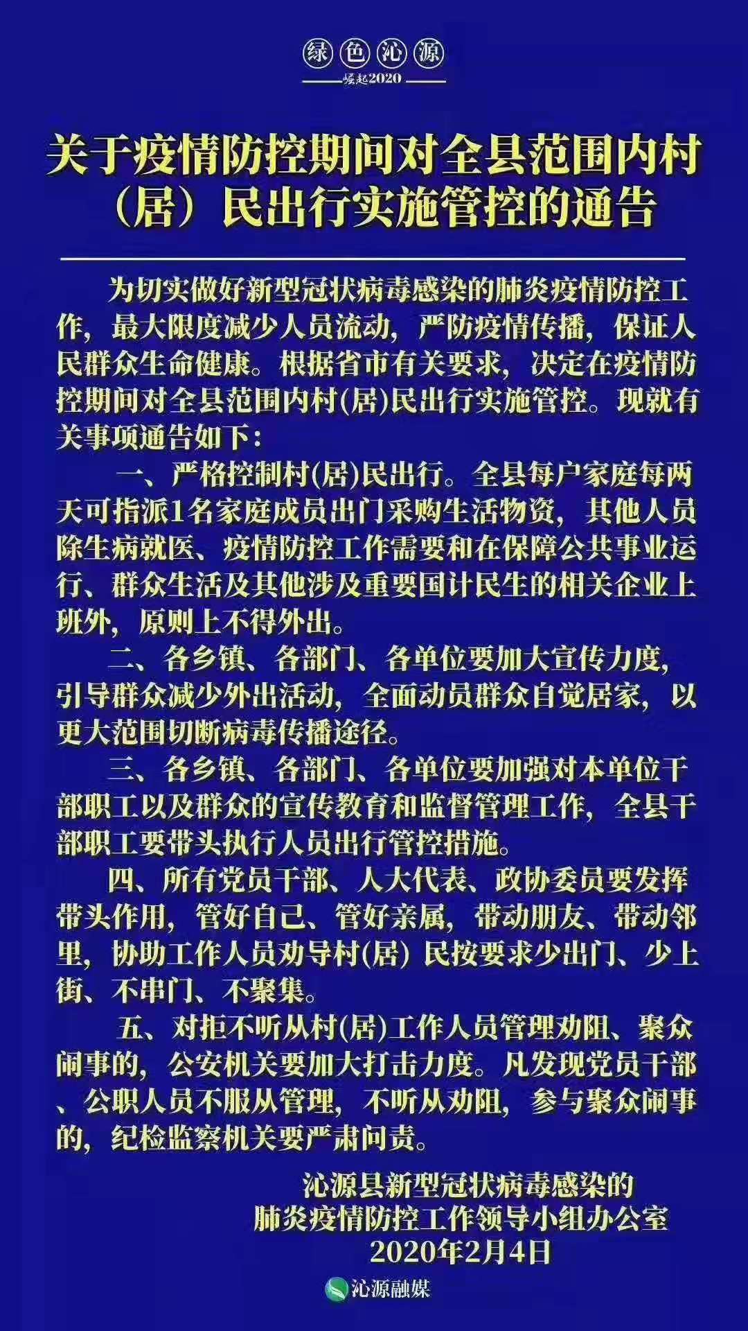 沁源县关于疫情防控期间对全县范围内村(居)民出行实施管控的通告