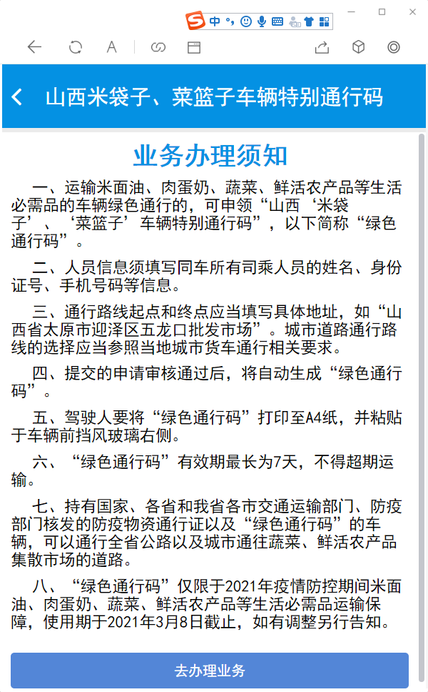 7、选择“山西米袋子、菜篮子车辆特别通行码”进入业务办理页面,点击“去办理业务”